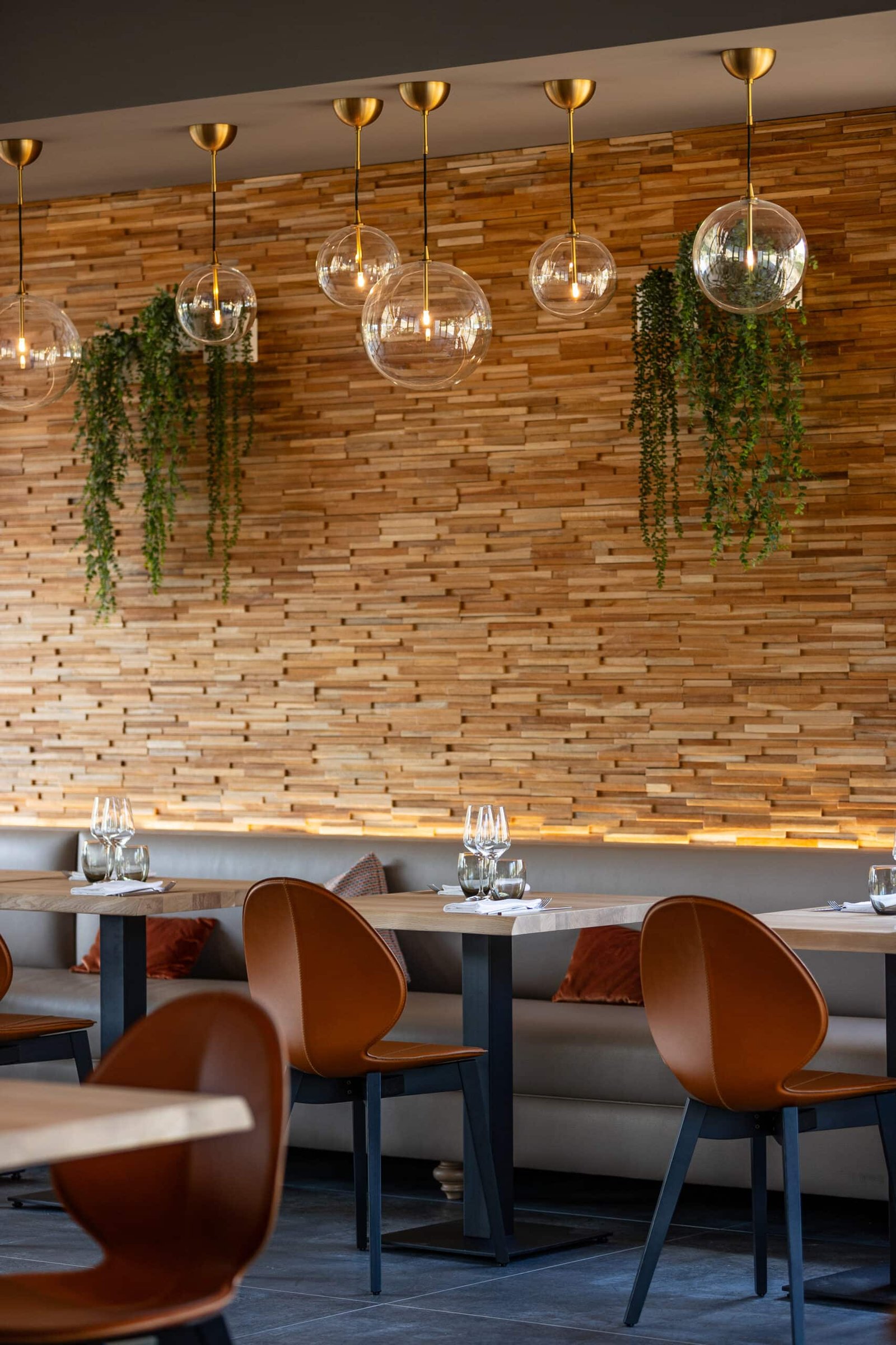 Notre objectif était de créer une atmosphère chaleureuse et accueillante, tout en conservant une esthétique contemporaine et élégante. Pour trouver cet équilibre, nous avons marié des textures naturelles à des détails raffinés : assises en cuir confortables, habillage mural en bois pour apporter de la chaleur, et luminaires en verre apportant une touche moderne. L’intégration de plantes et de miroirs accentue la profondeur et la vitalité, donnant au lieu une ambiance vivante et conviviale.