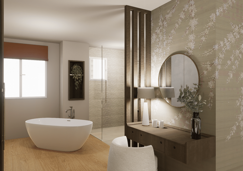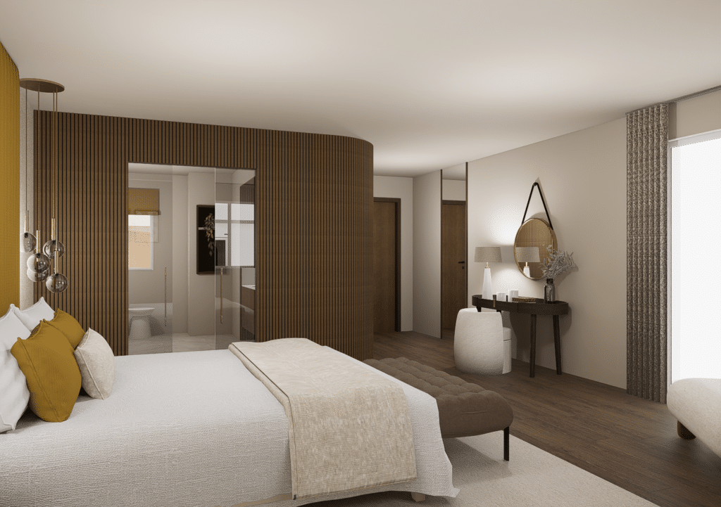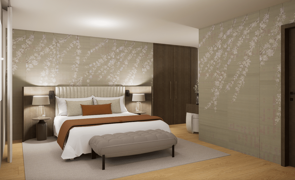 L’atmosphère intérieure s’appuie sur un jeu subtil de matières, de tissus et de revêtements muraux, sélectionnés avec soin auprès d’éditeurs européens. Ces choix apportent profondeur, texture et caractère, tout en créant une ambiance douce et enveloppante.